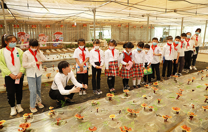 在安惠江海志愿者陳駿驊的帶領(lǐng)下,孩子們來到蕈菌園近距離觀看靈芝寶寶的栽培和生長。初夏時節(jié),蕈菌園里的靈芝初長成,嬌白嫩黃,亭亭玉立,孩子們?nèi)滩蛔】匆豢?、摸一摸、聞一聞,感受這些精靈們的美好和神奇。靈芝是怎么長出來的?多久可以成熟?千年靈芝真的存在嗎?孩子們邊參觀邊提問,靈芝文化的種子在心中悄然播種。